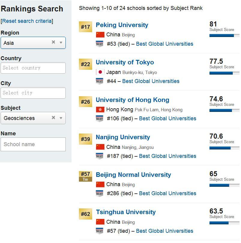 大陆进入地球科学门类榜单(前100名)的大学还有南京大学(第39名)、北京师范大学(第57名)、清华大学(第62名)、中国地质大学(武汉)(第89名)、兰州大学(第96名)。此外,港澳台地区的香港大学(第26名)、国立台湾大学(第70名)也进入地球科学门类榜单。