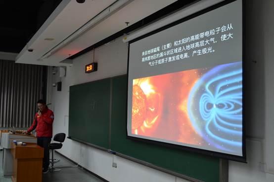 报告之后的提问环节则是惊喜不断,同学们纷纷向吴桐抛出各种问题。大家首先关心的就是如何去南极参加考察活动的机会。吴桐介绍了报名参加南极科考的途径:只要选择相关的专业方向,经过一些课程学习,成为研究生之后就有机会争取。就大家关心的南极冰盖情况,吴桐从大陆冰盖的形成,到降雪引起冰盖向海里移动,形成冰山,到对于冰盖的钻探和取样研究,完整地进行了回答。有同学提到电影《南极之恋》中出现的巨大冰裂缝,吴桐向大家作了科普,表示其形成于冰盖受到海水的潮汐作用的挤压,在近岸常见小裂缝,属于安全范围;向海盆方向发育大型裂缝,存在极大危险,不会有人接近。关于有同学提问的生态环境保护问题,吴桐解释,生活垃圾会分类进行处理,采用燃烧的方式完成部分固体垃圾的处理,产生的废气要达标后才能排放;对可降解的固体垃圾和液体垃圾,采用微生物手段处理;最后,还有部分垃圾需要通过带离的方式解决。针对有同学提到的饮食和心理调节问题,吴桐说营养师和心理疏导都是在远程提供服务,现场更多依靠队员们自己;他还透露到尽管在中山站有一个小温室种植蔬菜,但是大家还是依靠维生素片作为主要来源。对于其他问题,吴桐也都一一释疑,比如关于去往南极是否需要购买保险,以及南极科考和载人航空对于参加人员的标准的比较。提问的重点环节出现在科学考察的相关问题上。关于本次科考和自己研究的比较,吴桐回应到本次在南极的科考与自己研究有差别,但是在南极的优势是可以观测极光,还有极区的电离层,这些对于空间物理的研究都十分重要。关于北极和南极研究的差别,吴桐介绍到在物理上,南极和北极的现象比较对称,通常研究不分南北极。最后,吴桐针对大家对于极光的好奇,对其产生原理作了简单阐释:来自地球的磁尾和太阳的高能带电粒子从地球磁场的漏斗区域沿着磁力线进入地球高层大气,使得大气分子和原子激发电离,从而产生极光。为了便于大家理解,吴桐形象地把这一过程跟与老式显压管电视进行类比:太阳对应于电视中提供粒子源的电子枪,地球大气则好比荧光屏幕,这样极光就仿佛荧光屏幕上显示的电子图像一样显示在地球大气这一巨型屏幕上。因为地球磁力线的因素,极光呈环形分布在两级,背离太阳比较亮,面向太阳比较暗,不随地球而运动,其分布高度范围从100到1000 km,具有各种形状。极光的颜色以绿色为主,在太阳活动强烈时会见到红色和紫色。极光的产生离不开磁场,因此其他有磁场的星球也会出现极光,比如火星和木星。