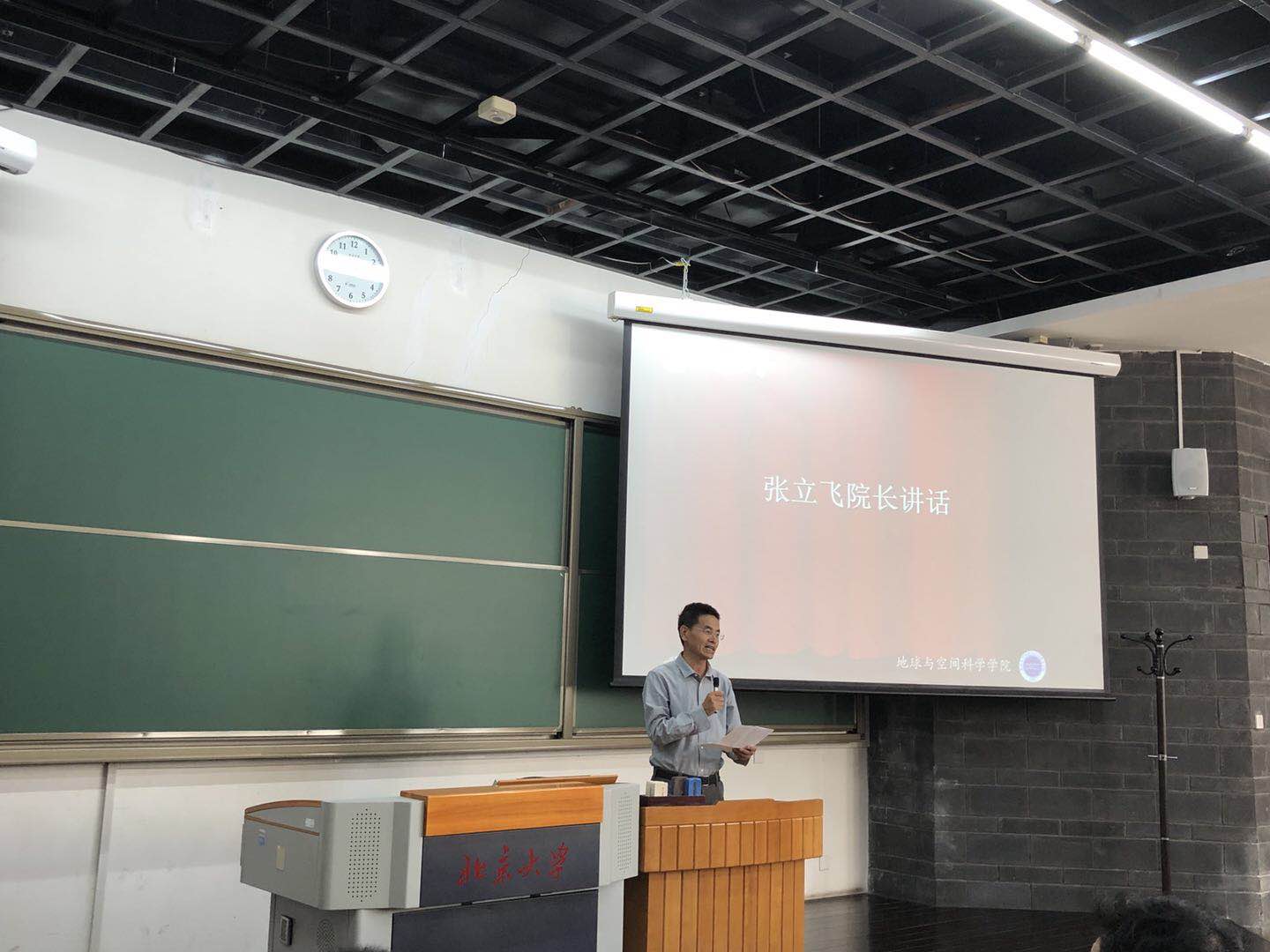 随着雄壮的国歌奏唱完毕,开学典礼正式开始。首先,张立飞代表学院对各位新同学来到北大、来到世俱杯中国官网入口表示了祝贺和欢迎。他向新生介绍了学院的发展历史和基本情况,经过全院师生十余年的不懈努力,地球科学学科成为北大首批进入全球1%的8个学科之一,根据US News 2017年度世界大学排名,在总数22个学科门类排名中,世俱杯中国官网入口共有17个学科门类榜上有名,地球科学门类位列全球第17名,亚洲第1名。随后,张立飞向新生们分享了三句话。第一句话是“生活不只眼前的苟且,还有诗与远方”。张立飞告诉同学们:选择地空,就是选择“诗和远方”——地球本身就是一首绵延46亿年的无言史诗,等待人类去破译和解读;而要做到这一点,就需要地球科学家们背起行装,去向远方,从城市走向野外,从课堂走向自然,去领略壮丽的山川河流,去感受别样的风土人情,去谱写属于自己的诗意人生。他希望新生们牢固树立专业思想,全身心体会地球与空间科学的无穷魅力。第二句话是“脚踏实地、仰望星空”,这是世俱杯中国官网入口的学院精神。张立飞激励同学们继承学院的优良传统,志存高远、踏实为学,瞄准重大科学问题,勇攀地球与空间科学高峰。第三句话,也是最重要的一句话,是“爱国、励志、求真、力行”。张立飞要求新生们谨记习近平总书记今年五四前夕考察北大时对青年学子的殷切期望,要立志把个人发展同国家富强和人类文明进步结合起来,在中华民族伟大复兴的宏伟史诗中谱写属于北大地空人的青春篇章。