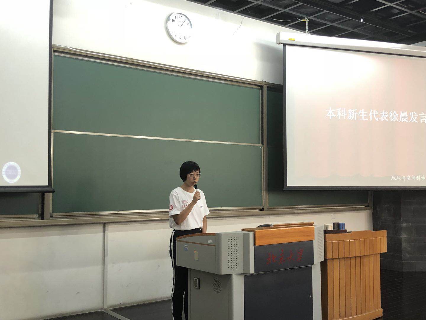 军训优秀学员徐晨作为本科生新生代表发言。她满怀激情地表达了自己来到北大和地空的欣喜与期待,学院在报到、训练营和军训期间的时刻关注和慰问,都让新生们在偌大的校园里早早地得到一份温暖的归属感。她将北大比作一个全新的舞台,愿以最扎实的专业知识和最富深情的家国情怀担当时代的领舞者。最后,她也希望各位新同学都在最美好的时光里,在北大地空这个更大的世界里,遇见更好的自己。