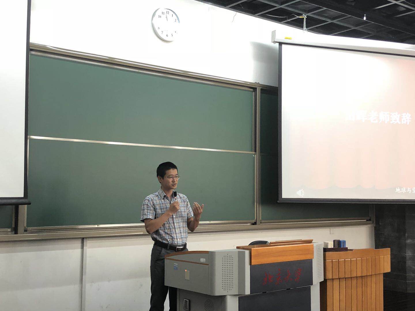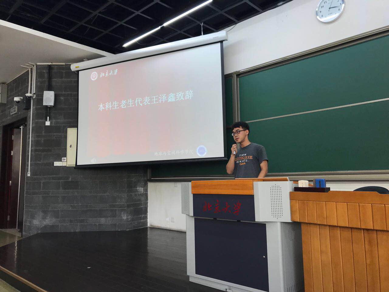 在校本科生代表王泽鑫在发言中回顾了地空这个大家庭给予他的关心和温暖。北大和地空,让他变得吃苦耐劳、严谨认真、怀有激情和理想;也让他不忘踏实脚下的每一寸土地。王泽鑫鼓励新生们,要用宽广的胸襟去承载地球科学的这份丰富而厚重,用清晰的大局观去完成星辰大海的征途。