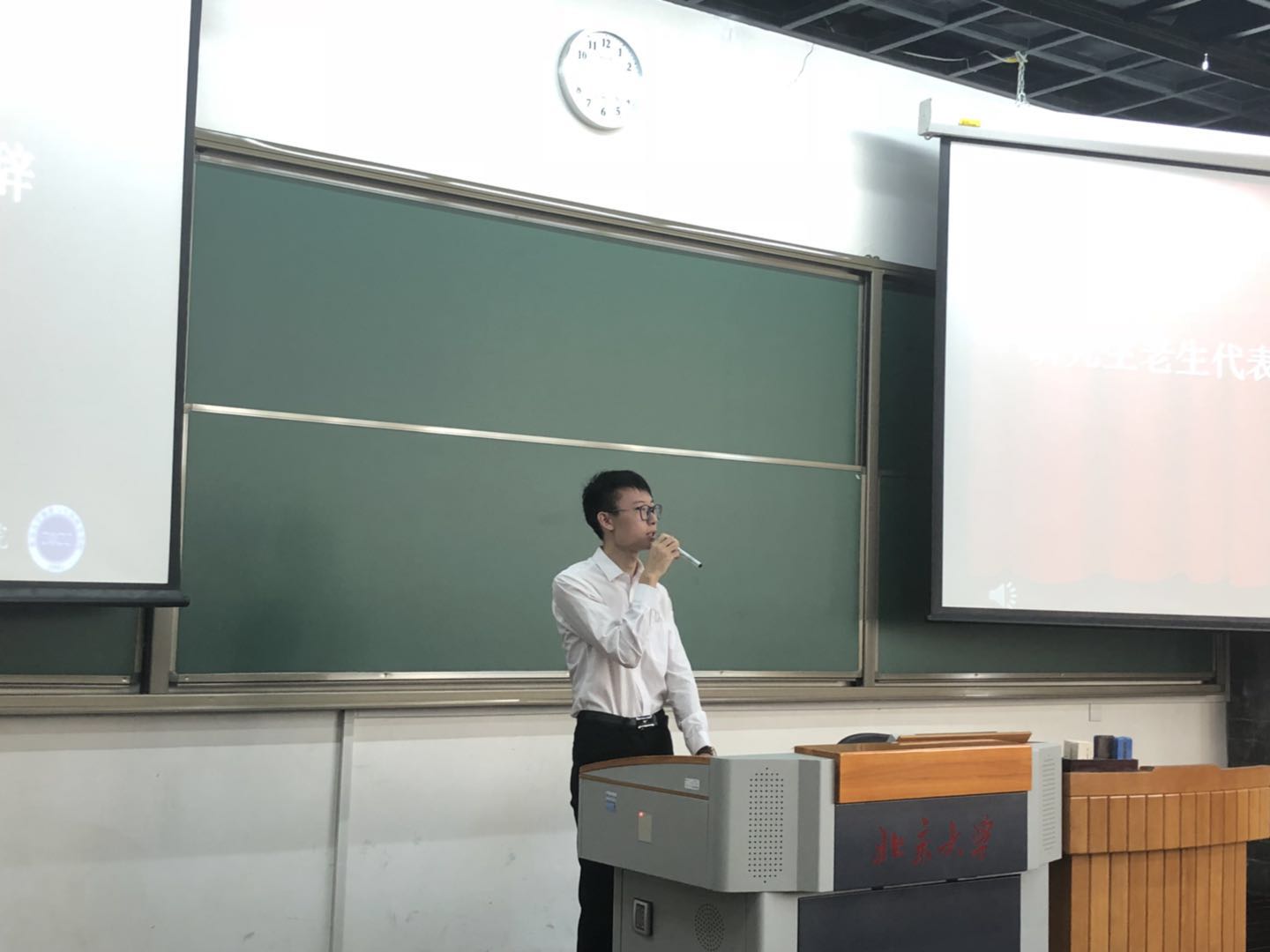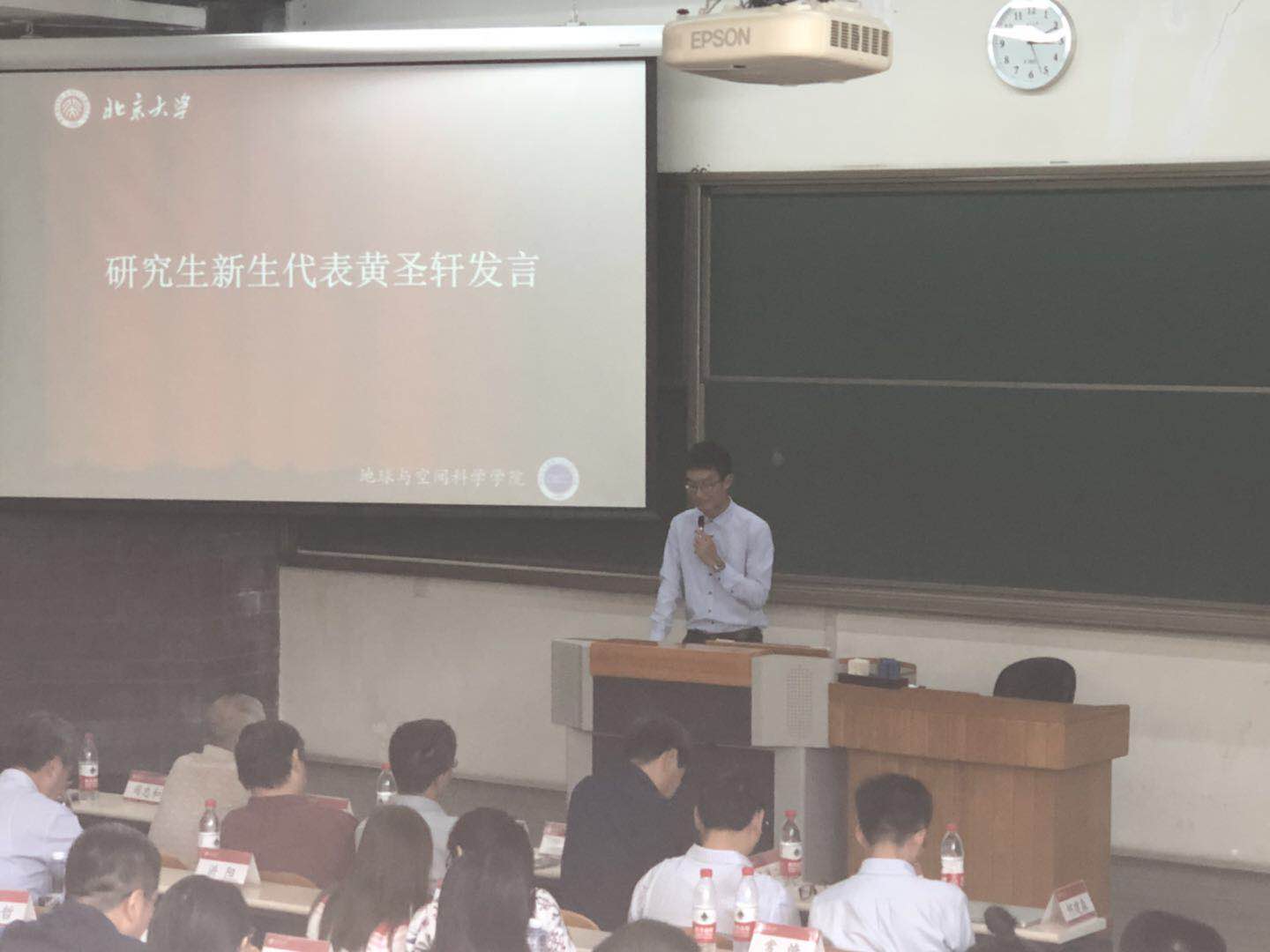 全国李四光优秀学生奖候选人黄圣轩作为研究生新生代表发言。他作为博士生,已经是第三次作为新生进入燕园学习,是北大变化的见证者与体验者。他感慨到,北大与其它高校的不同,在于无时不在的思想碰撞,在于北大无与伦比的学术氛围。对于科研方面,他认为,想要取得真正的成就,一定要甘于坐冷板凳。同时,他希望各位研究生不要闭门造车,要学会利用学院丰富的学术资源,学习各个专业的知识。