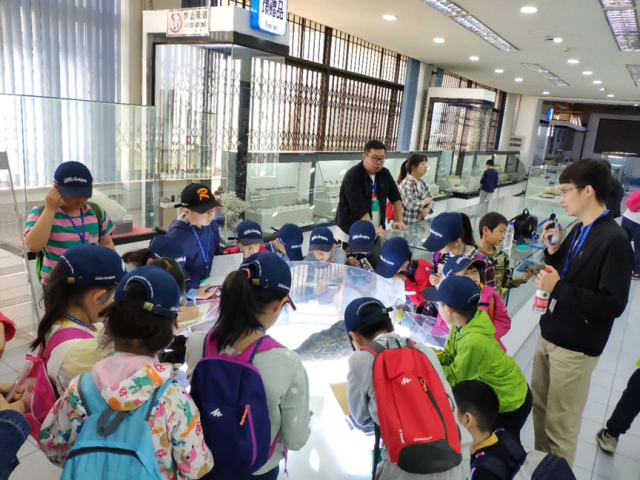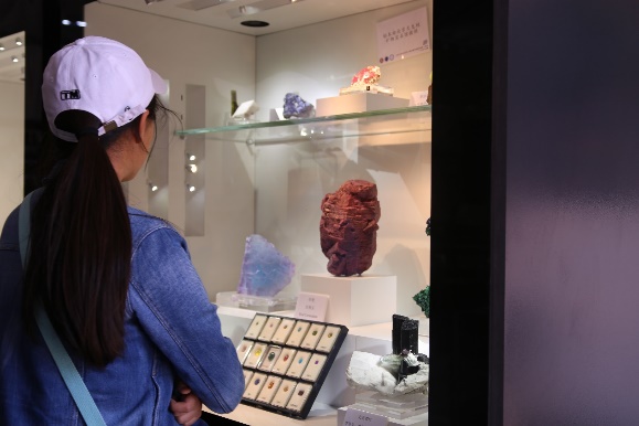 讲解员们向同学们介绍岩石、矿物、化石标本