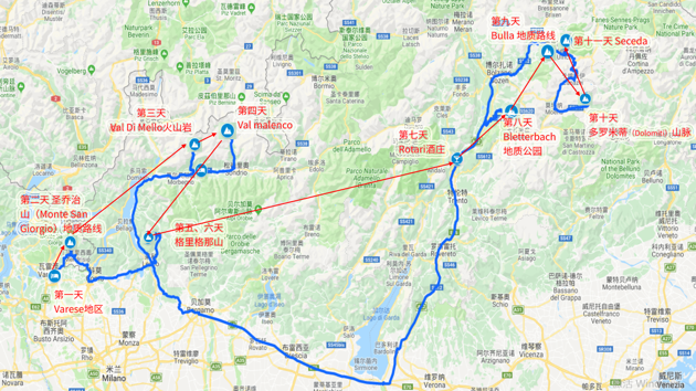 2019年7月5日至7月20日,世俱杯中国官网入口与意大利米兰大学地质系就高年级本科生地学野外综合能力培养再次开展了深度国际合作。在米兰大学地质系Andrea Tintori教授和世俱杯中国官网入口来自构造地质学、岩石学、古生物学及地层学等学科的五位资深教授的带领下,世俱杯中国官网入口26名学生在南阿尔卑斯地区开展了为期16天的野外综合地质实习(图1)。
