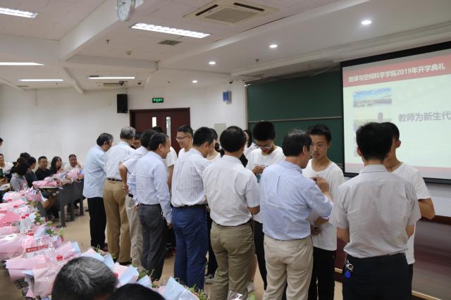 接下来,陈运泰院士、涂传诒院士、张立飞院长、李培军书记、赖勇副书记、宁杰远副院长、刘瑜副院长和何健森副院长为学生代表佩戴校徽。校徽承载着一个学校的灵魂,戴上校徽,意味着同学们正式成为“北大人”的一分子。朱漆灰瓦前,聆听先哲的教诲。湖光塔影中,领略科学的神奇。