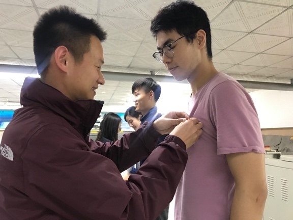 老师为学代表佩戴团徽