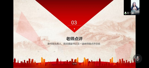 最后本次读书班学院负责人、院党委副书记王一涵老师对同学们的发言进行了总结。老师肯定了各组学员的选题和讨论成果,从五个主题依次进行了讲解指导。她鼓励学员们加强党史学习,关心时事热点和身边小事,不断提升党性觉悟,以饱满热情迎请建党100周年。