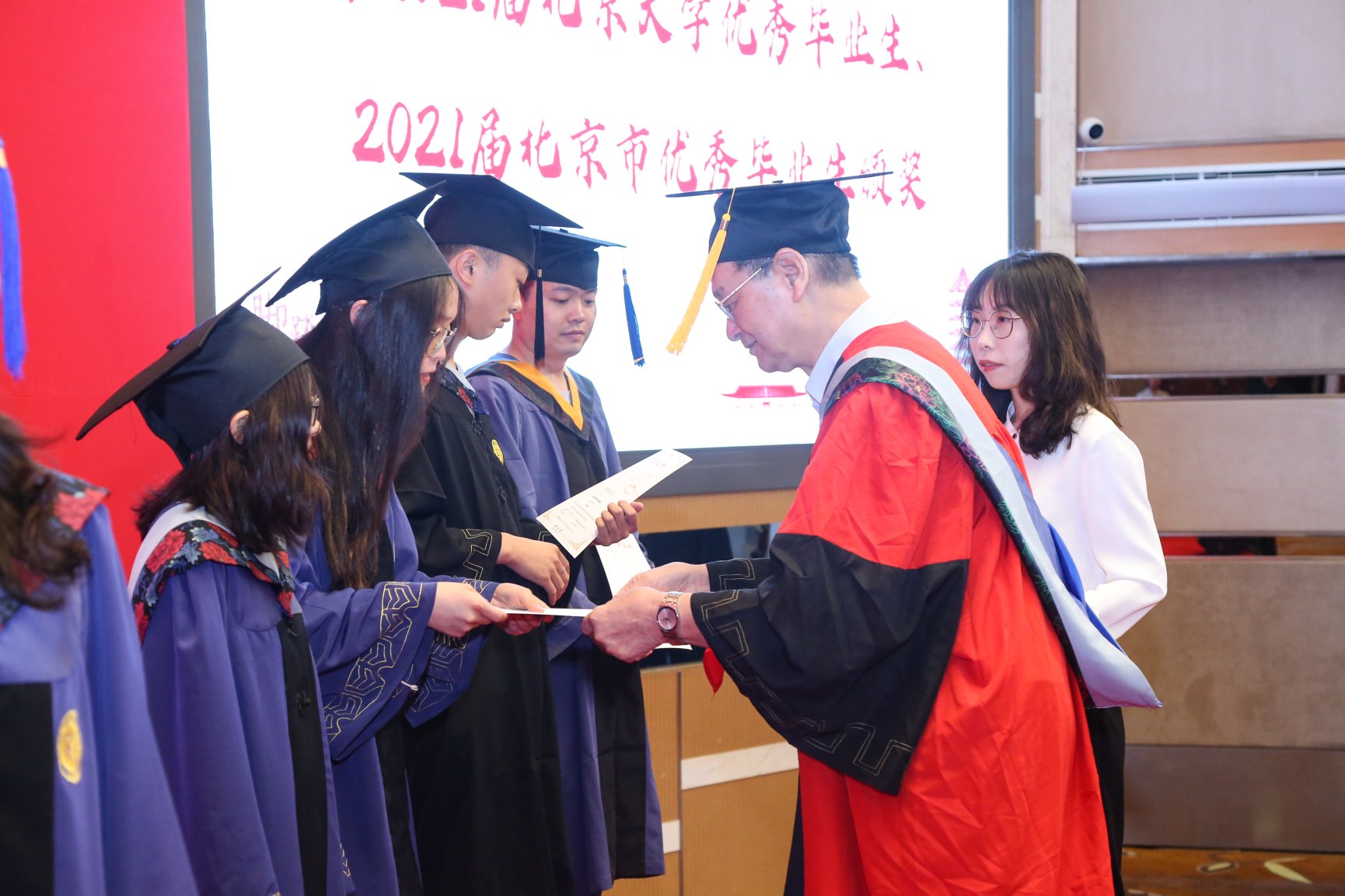 在刘瑜宣读学院毕业生名单、张立飞宣读获奖2021届世俱杯中国官网入口优秀毕业生和2021届北京市优秀毕业生名单后,陈运泰院士、涂传诒院士分别为优秀毕业生颁奖并合影留念。