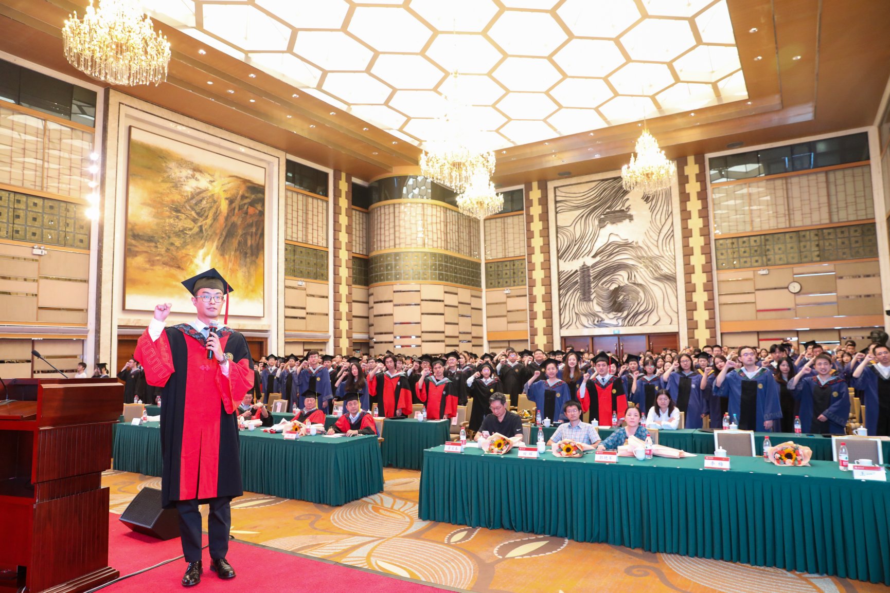优秀毕业生代表黄圣轩带领全体毕业生庄严宣誓:牢记师长的嘱托,牢记北大的爱国精神,牢记青年人的初心和使命,让青春在不懈奋斗中绽放绚丽之花!