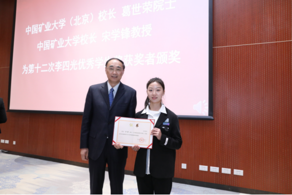 葛世荣为第十二次李四光优秀学生奖获奖者代表颁奖
