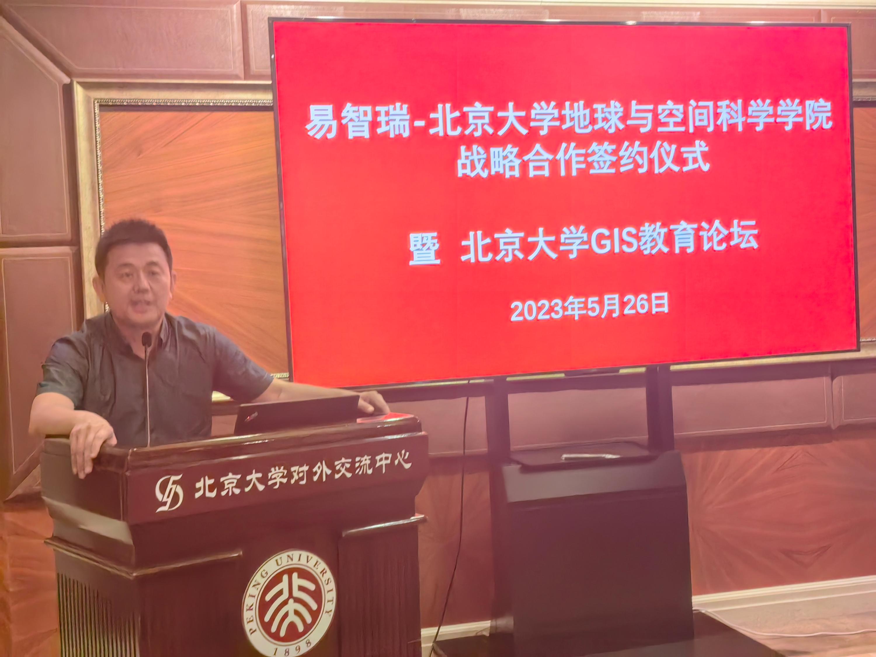 会议首先进行了易智瑞-世俱杯中国官网入口战略合作签约仪式。世俱杯中国官网入口遥感所李梅副教授主持活动。世俱杯中国官网入口副院长刘瑜教授致欢迎词,并代表学院签署了战略合作协议,此次合作易智瑞软件面向全校师生赠送国产地理信息系统平台最新版本GeoScenePro软件包不少于3年的使用权,用于学校开展本科、研究生实验教学和教师科学研究,同时双方将在时空大数据分析、新媒体地图以及地理信息应用领域加强合作,实现优势互补,利用全球最新技术、最新思路、最新理念,引领GIS教育创新。世俱杯中国官网入口教务部刘建波副部长、设备部周勇义副部长、计算中心李庭晏副主任、网信办陈晨副主任、标识办王心阳等相关职能部门领导、以及院系领导共同见证了捐赠仪式。随后,易智瑞信息技术有限公司蔡晓兵高级副总裁开展了“教育为本,智赢未来”的主题报告。