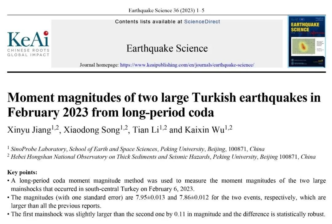 宋晓东团队2023年在地震发生后三周内于我国Earthquake Science发表关于土耳其地震文章。