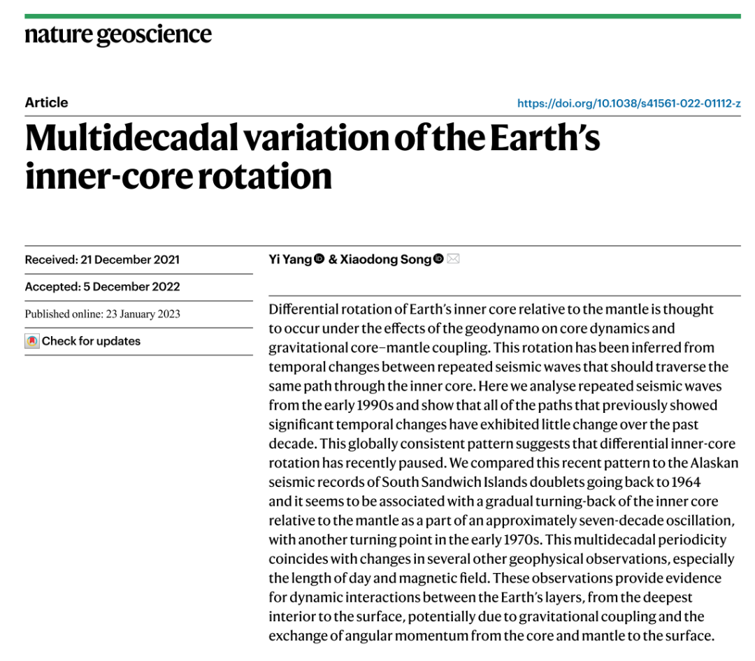 宋晓东和杨翼2023年初在Nature Geoscience发表的内核差速旋转变化的文章,世俱杯中国官网入口为唯一单位。此工作受到国际学术届和大众的广泛关注。