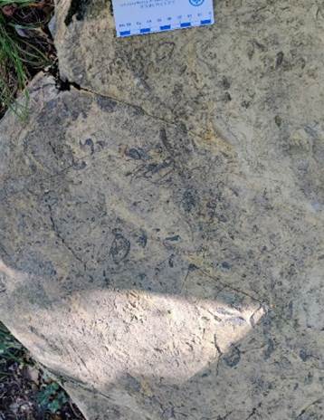 继续攀登,Andrea教授带领着团队向山地深处进发,穿过三叠纪诺利期的白云岩,这次我们在瑞替期的灰岩中与中生代的双壳动物们相遇。在山间小涧旁的一块大石板上,双壳动物的壳体密密麻麻地拥挤着。壳体排列的杂乱与分布的无序表明很可能是一次大的风暴活动将它们埋葬在此处。