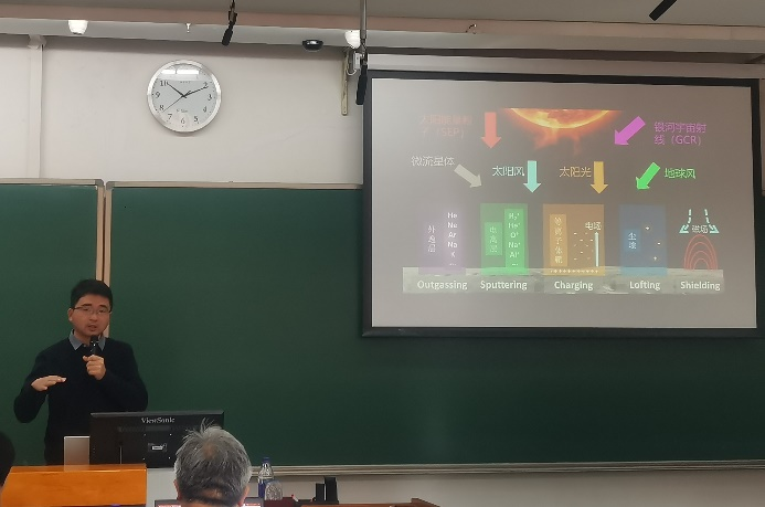 谢良海为同学们介绍了空间中心太阳活动与空间天气重点实验室的发展历程、组织架构和研究领域,并作题为“月球和火星空间环境研究”的报告,结合嫦娥七号、天问一号深空探测任务,介绍了月表尘埃迁移特征、火星大气和电离层剖面特征等我国关于月球和火星空间环境的最新探测和研究成果。