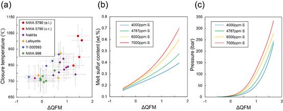 图1 (a) 本研究所得的NWA 5790 nakhlite钛磁铁矿-钛铁矿闭合温度和氧逸度(红点),与前人所做的nakhlite中钛磁铁矿-钛铁矿的闭合温度和氧逸度进行比较。(b) 总硫含量与氧逸度的去气模拟。(c) 压力与氧逸度的去气模拟。