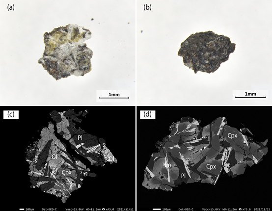图2 嫦娥五号月海玄武岩的岩相学。Ol=橄榄石,Cpx=单斜辉石,Pl=斜长石。
