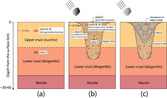 中铁陨石是含有约一半铁相和一半硅酸盐相的陨石。目前,学界关于其形成的具体过程和其母体小行星还存在相当大的争议。NWA 12949是2019年发现于摩洛哥的2A型中铁陨石。岩相学观察表明,该陨石经历了复杂的结晶与变质历史,具体体现在:1. 硅酸盐岩屑具有明显的角砾化,且冲击熔融和快速结晶产生的基质在硅酸盐岩屑中广泛存在;2. 不同硅酸盐岩屑的岩相学结构和化学成分各不相同,可见辉长结构、辉绿结构、次辉绿结构、嵌晶结构、斑状结构等不同的岩相学结构,以及基性和超基性等不同的化学成分;3. 单斜辉石岩屑发育广泛的两组出溶条带,表明至少有两次冷却事件;4. 橄榄石和辉石边部存在变质反应边,由金属中溶解的还原物质在高温下与硅酸盐反映的结果。通过化学成分比对,可确定NWA 12949中的硅酸盐岩屑与灶神星陨石匹配,而其与灶神星陨石的岩相学差异可由变质反应来解释,因此这些硅酸盐岩屑来源于灶神星。不同类型的岩屑来源于灶神星地壳的不同深度,且经历了不同的冷却速率和变质历史。根据以上观察,建立了中铁陨石的三阶段演化模型:1. 硅酸盐矿物在不同深度的原始结晶,形成不同化学成分的矿物,以及辉石中的出溶条带(图3a);2. 第一次撞击作用使灶神星地壳发生部分熔融,产生了快速冷却的基质和不同冷却速率的角砾化岩屑(图3b);3. 第二次撞击作用使角砾化岩屑和金属发生混合,同时发生变质反应,并将不同深度的岩屑带到地表,形成中铁陨石NWA 12949的岩相学结构和矿物学特征(图3c)。相关成果将发表于Wang Z. L., Tian W. Petrology and Minerology of Mesosiderite Northwest Africa 12949: Implications for geological history on the mesosiderite parent body. Submitted to Meteoritics & Planetary Science.