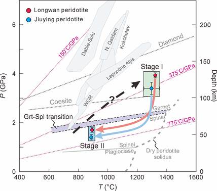 图2: 冀东太古宙超高压橄榄岩变质P-T轨迹图。阶段1:冀东太古宙超高压橄榄岩在折返前位于石榴石稳定的岩石圈地幔深度(110–130 km),可能是在新太古代板块俯冲-碰撞过程中从地壳层次带至此深度;阶段2:冀东太古宙超高压橄榄岩被抬升至地壳层次,伴随着石榴石分解和辉石中不同矿物的出溶。