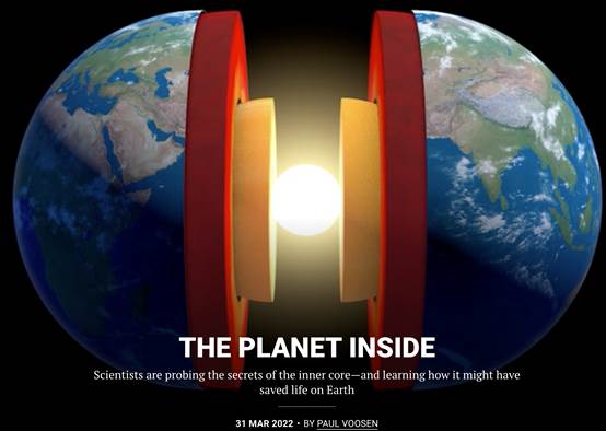 1. Voosen, P. (2022). Scientists are probing the secrets of the inner core—and learning how it might have saved life on Earth. Science, 376(6588), 18-22. https://doi.org/10.1126/science.abq2618
