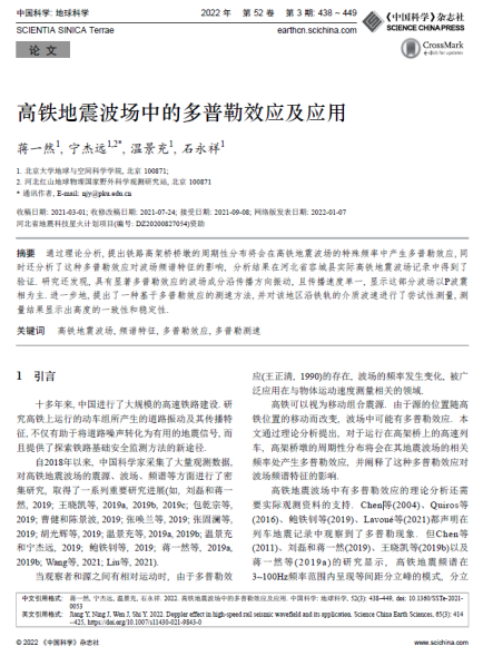 中文:蒋一然,宁杰远,温景充,石永祥. 2022.高铁地震波场中的多普勒效应及应用.中国科学:地球科学, 52(3):438−449, doi:10.1360/SSTe-2021-0053