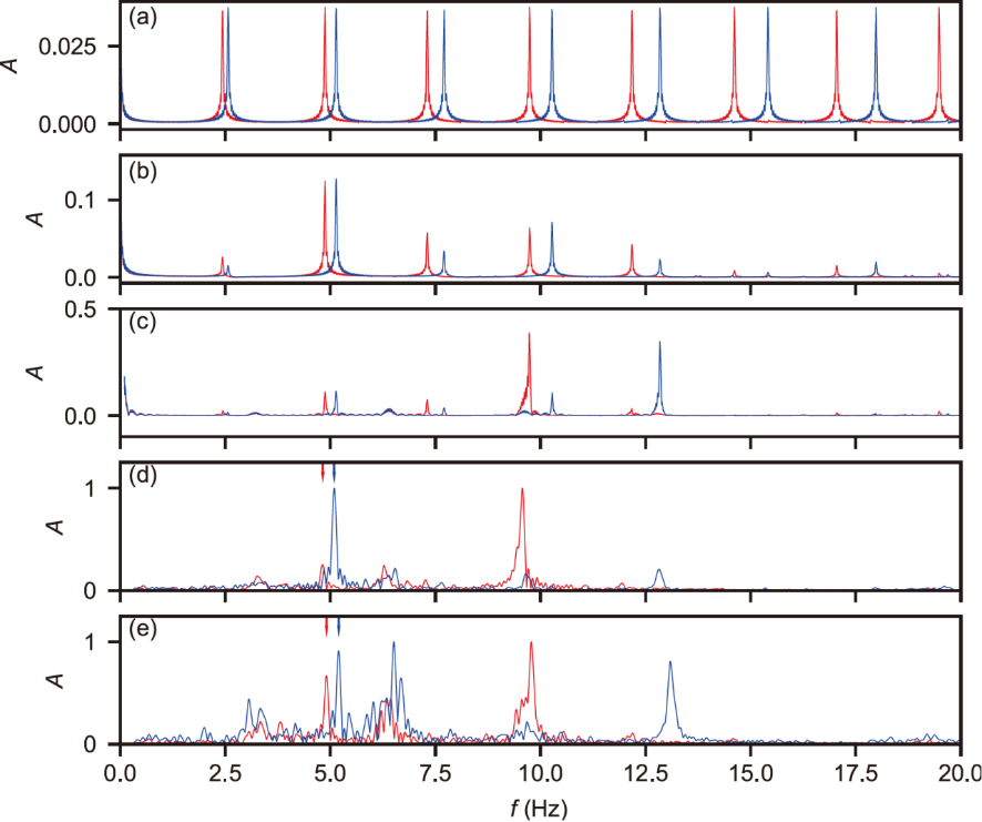 (a)单节车厢单组轮子;(b)单节车厢4组轮子;(c)多节车厢4组轮子。横轴是频率,纵轴是振幅谱的幅值。蓝色,车到前;红色,车到后。(d)和(e)中蓝色和红色箭头分别标明拾取到的车到前、车到后二倍桥频的位置