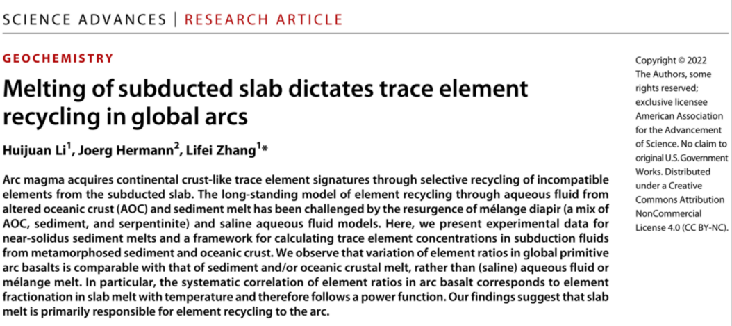 最近张立飞教授课题组与瑞士波恩大学Joerg Hermann教授合作,在俯冲带岛弧岩浆成因岩浆方面研究取得重要研究进展,提出了岛弧玄武岩浆俯冲板片熔融新模式。该项成果于2022年1月12日发表在Science Advances上(Li et al., Sci. Adv. 8, eabh2166 (2022) 12 January 2022, https://doi.org/10.1126/sciadv.abh2166),李慧娟副研究员是该文的第一作者,张立飞教授是通讯作者,世俱杯中国官网入口为第一完成单位。该项研究获重点研发计划项目(2019YFA0708501)资助。