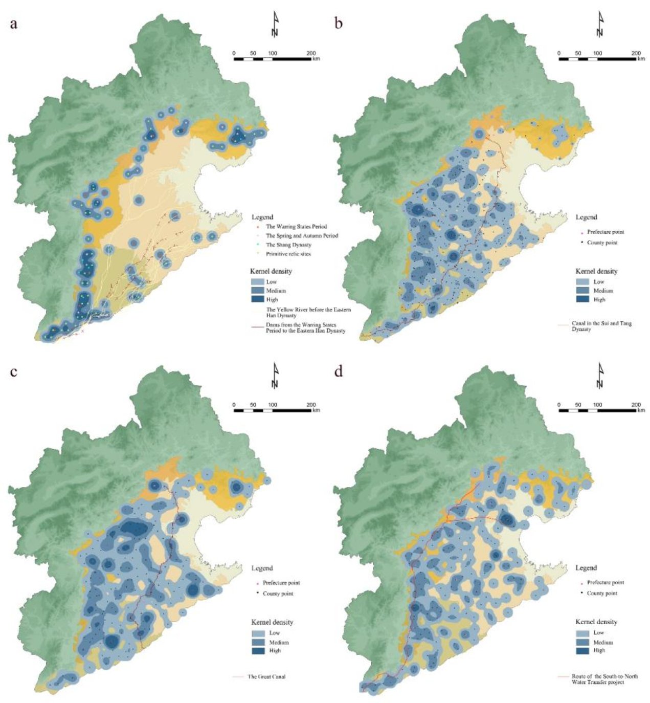 图2 不同时期的城市分布核密度。a:秦朝以前;b:秦至宋;c:元至清;d:2014年