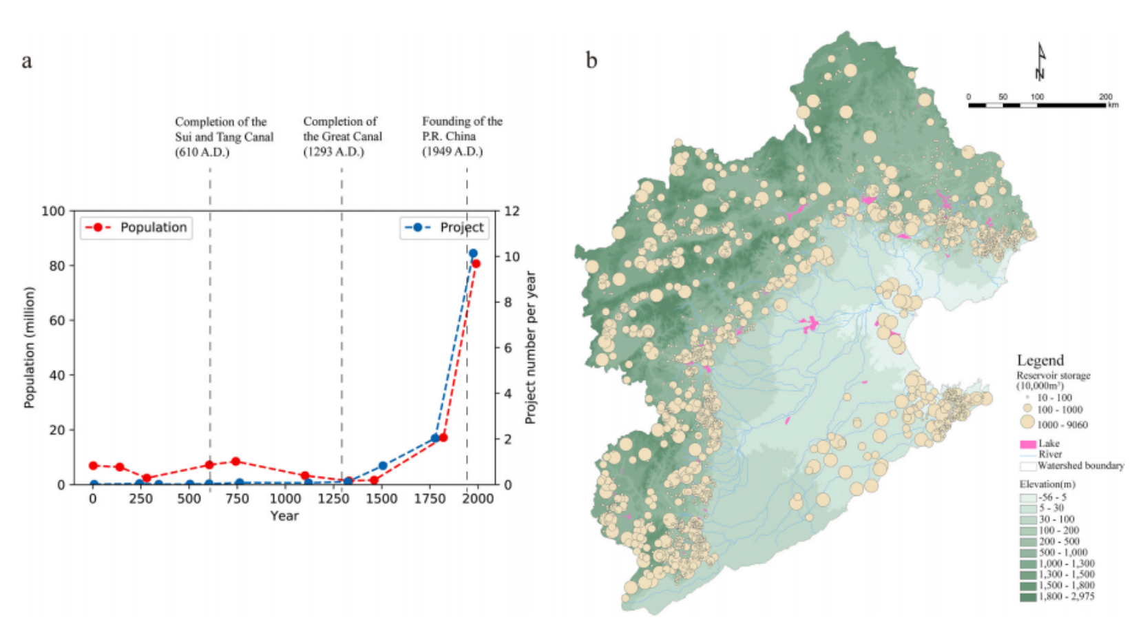 图4 a)2000年来人口增长和水利项目关系曲线 b)建国以来海河流域水利工程分布。