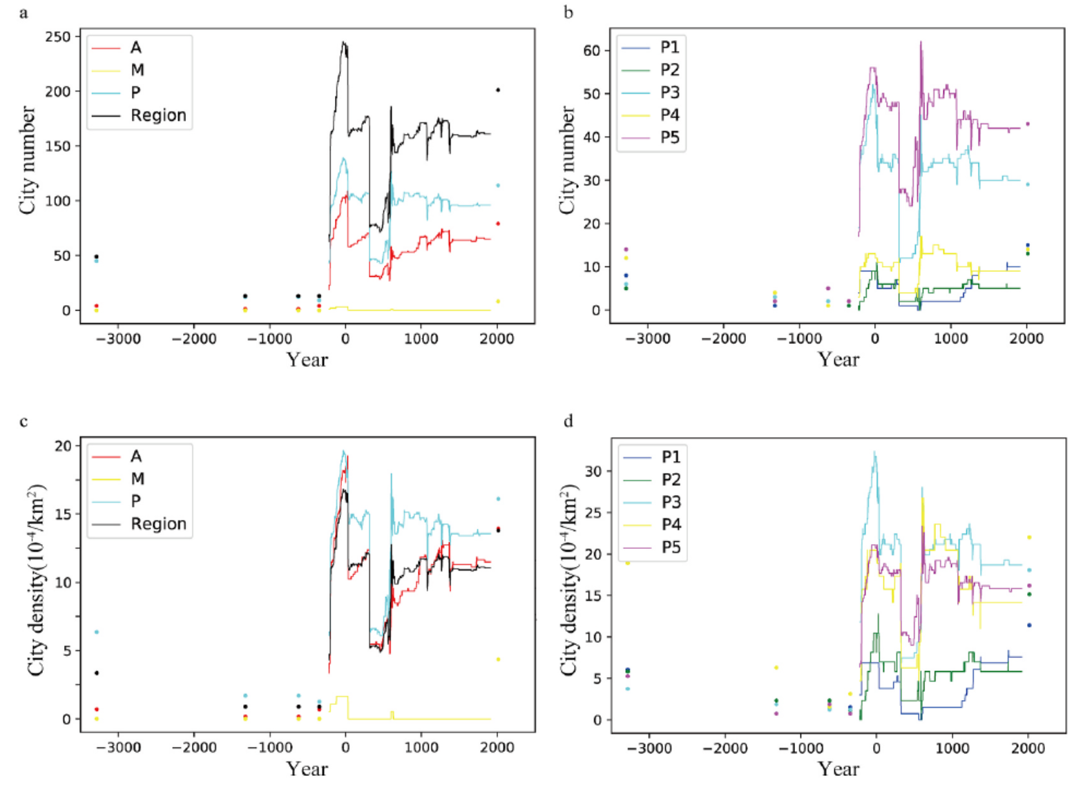 图3 研究区域和亚区内城市数量和密度的变化。A:河流冲积平原;M:滨海平原;P:山前沉积平原;P1-P5:以主要山前河流作用区域划分的山前沉积平原亚区;Region:研究区域。