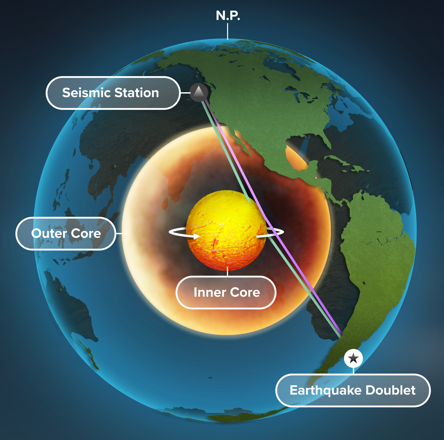 利用同一地点不同时间发生的重复地震探测内核变化的示意图。地震(南美外海)产生的波通过内核反射(紫色射线)或者透射(绿色射线)返回地表(中亚)。研究表明地震波变化主要来自穿过内核的透射波波,内核差速旋转(白色箭头)为最简单和合理的解释。(制图受Michael Vincent帮助)。