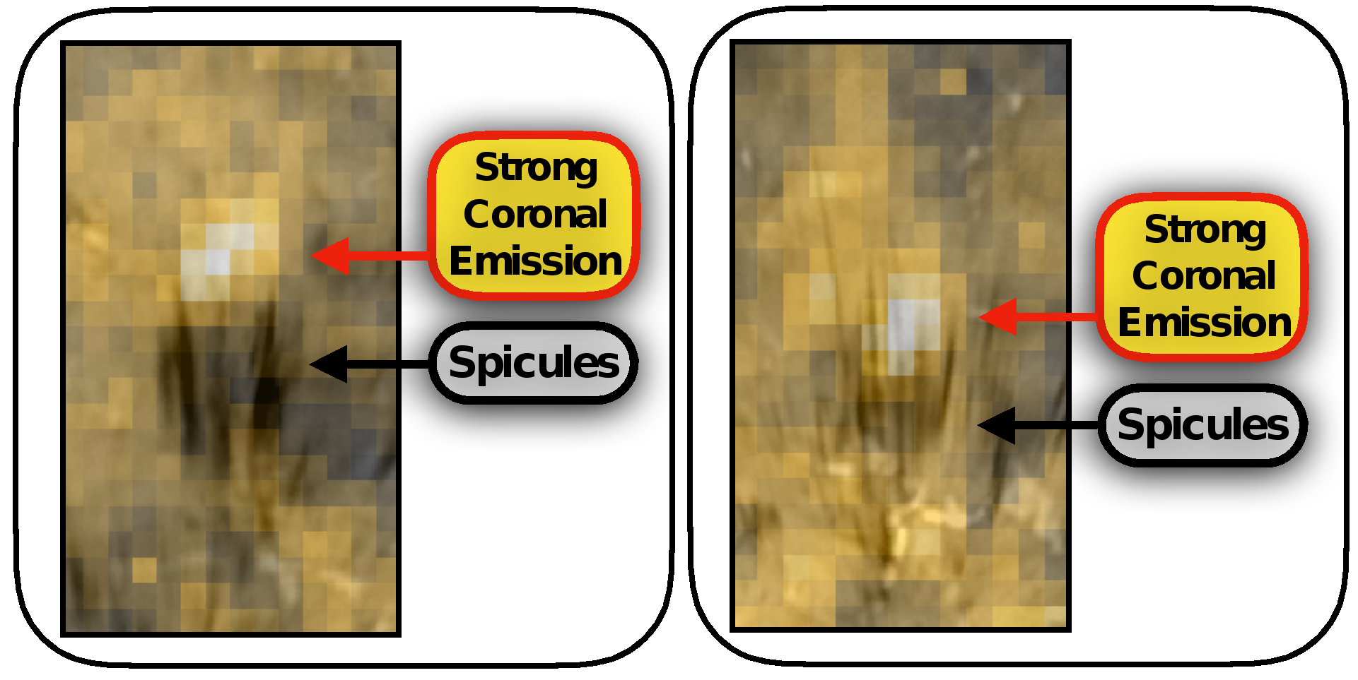 图5针状物被加热到日冕温度。图中黑色部分为Hα谱线观测的针状物,黄色部分为AIA 171 Å波段观测的日冕辐射。图中展示的两个例子均显示针状物上端出现增强的日冕辐射(Samanta, Tian, Yurchyshyn, et al. 2019, Science)