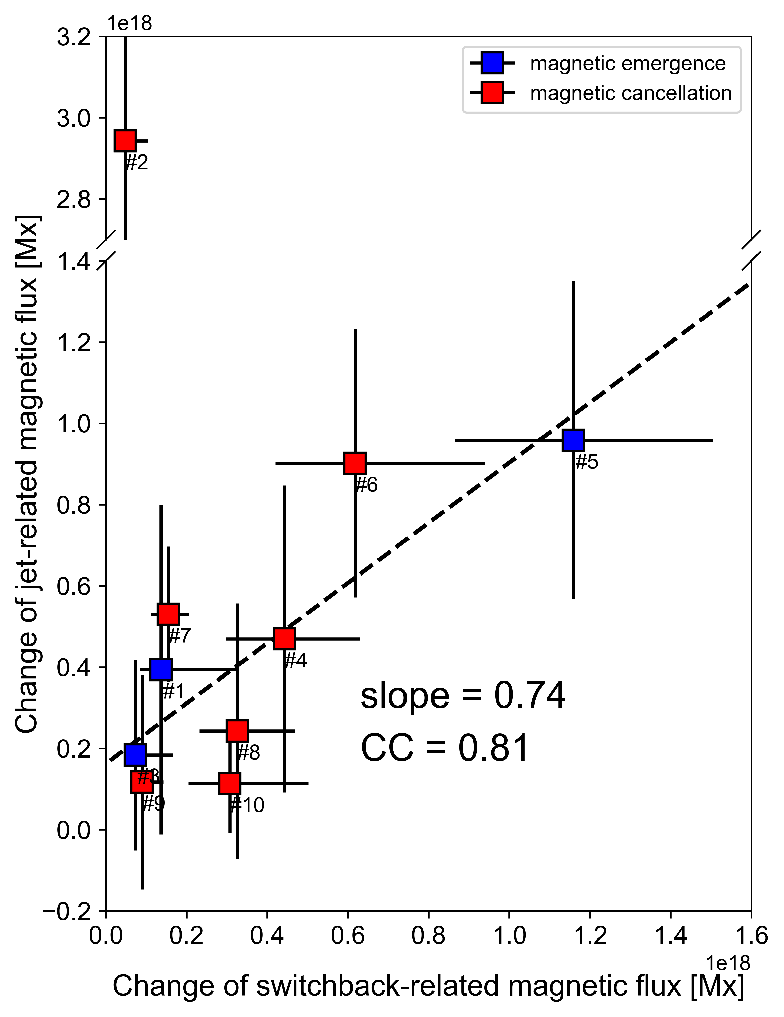 图5. 太阳大气喷流活动与行星际太阳风速度脉冲/磁场急转伴随的磁通量变化的相关性分析。