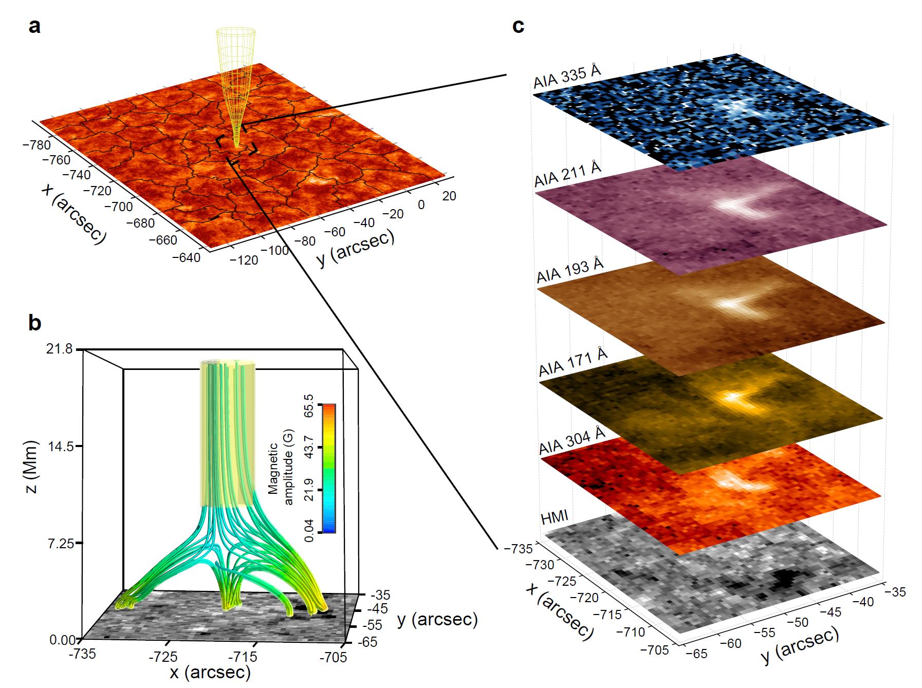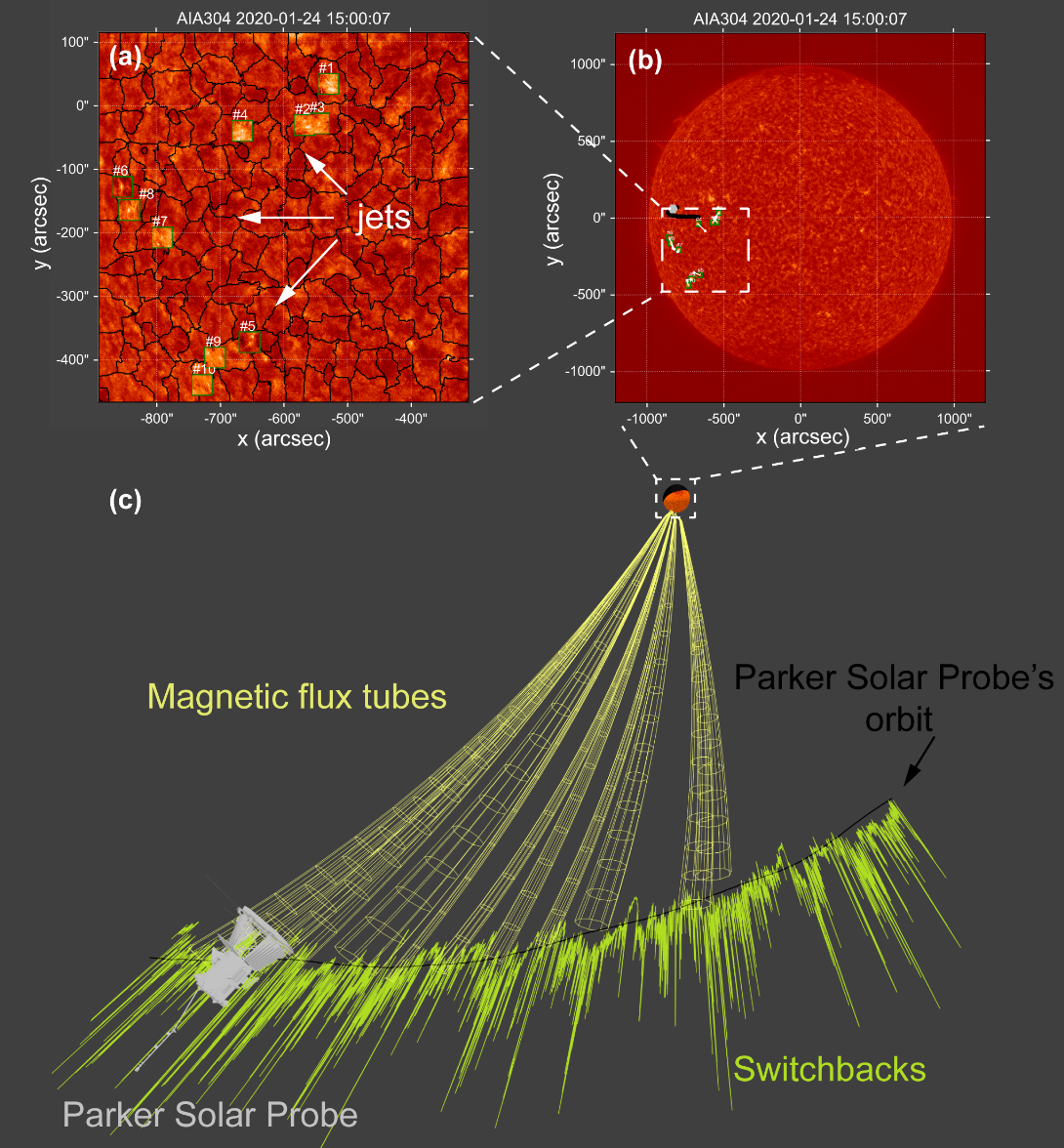 图2. 针对PSP抵近太阳探测到的速度脉冲/磁场急转频发事件,基于“时空回溯定时定位”方法,重构出从PSP到日面源区的多个磁通量管结构,定位到日面源区位于色球网络组织边界处,定时到色球网络边界处发生的多个精细喷流活动。