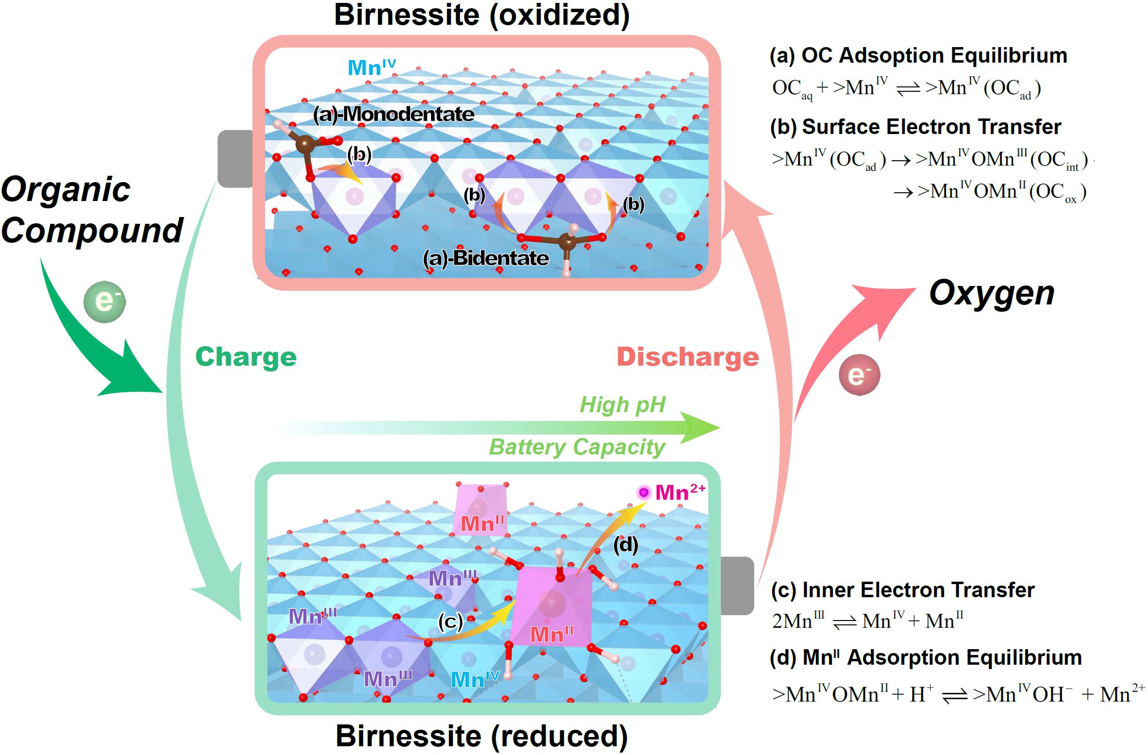 图3.自然界中水钠锰矿地质电池示意图。在自然环境中,有机质作为主要的电子供体,向水钠锰矿提供电子实现充电过程(以绿色表示);同时,氧气作为主要的电子受体,氧化水钠锰矿实现放电过程(以红色表示)。