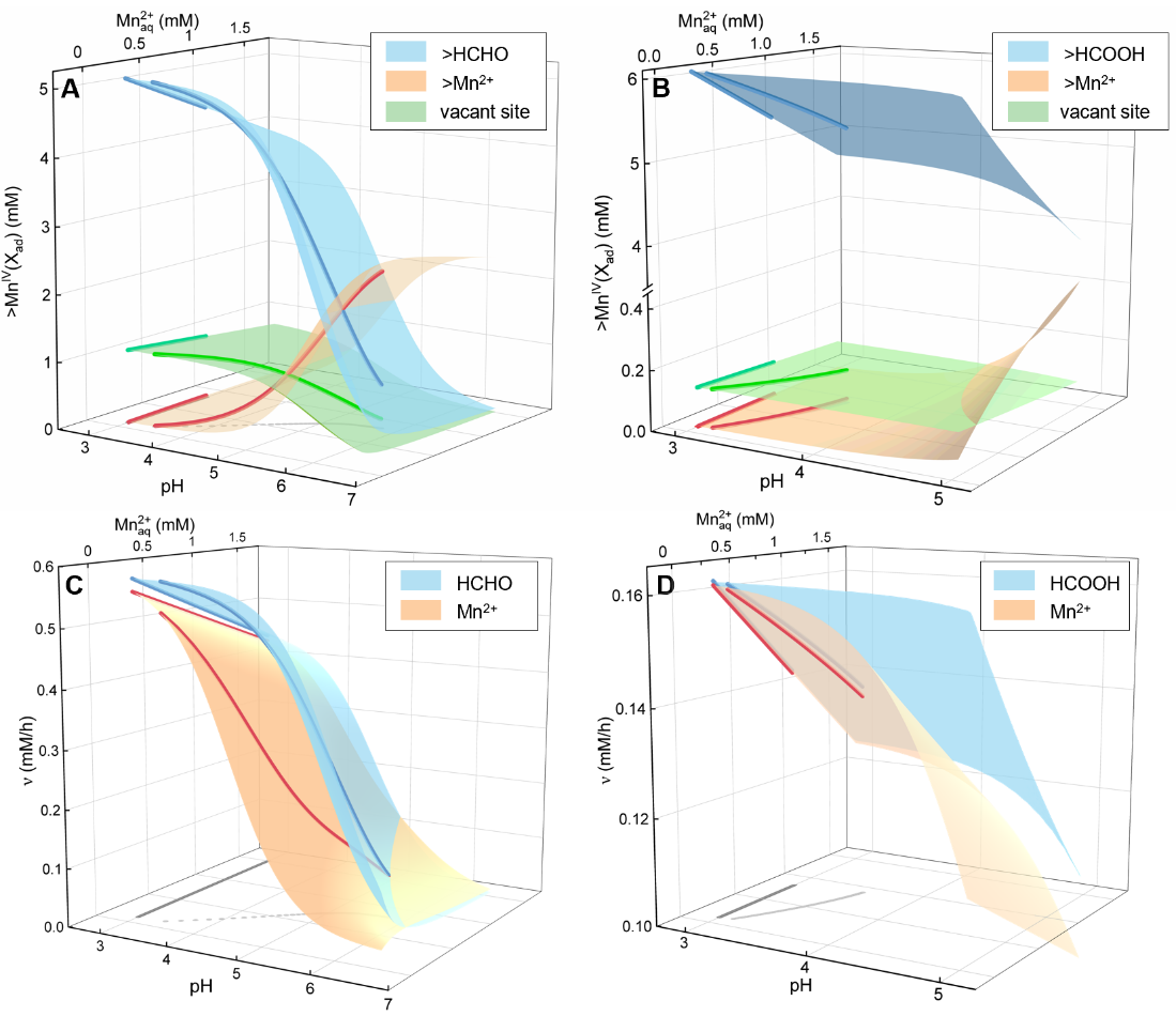 图2.三维模型显示(A、B)pH和Mn2+浓度变化下不同物种的吸附浓度以及(C、D)有机质氧化和Mn2+释放速率。